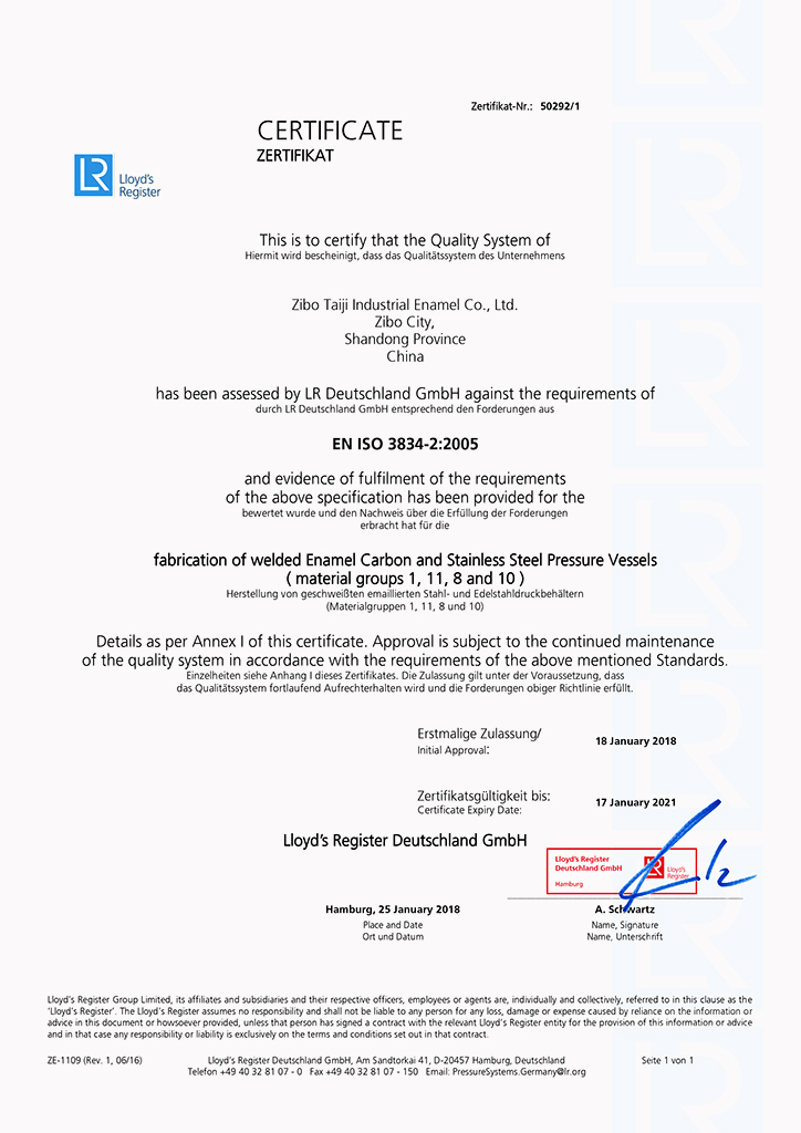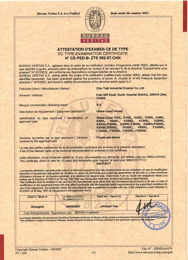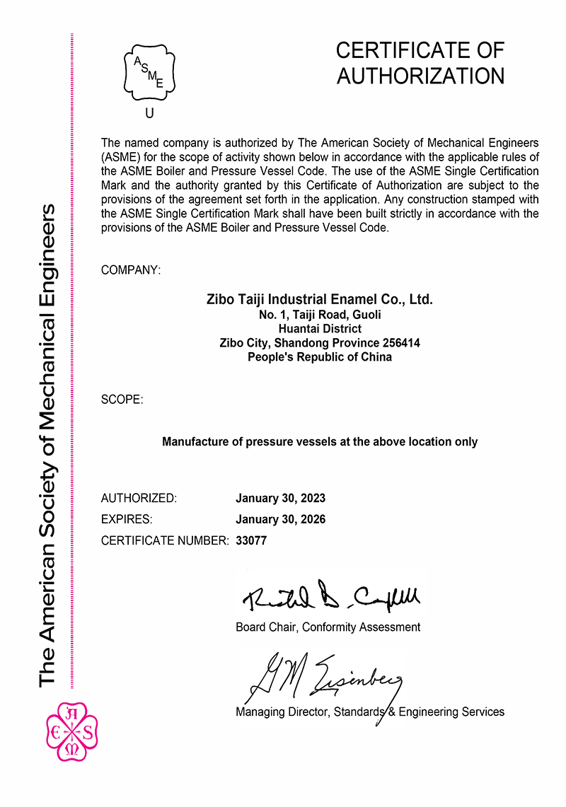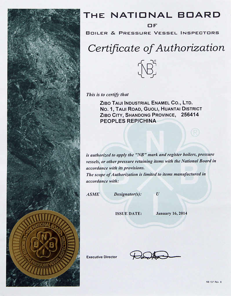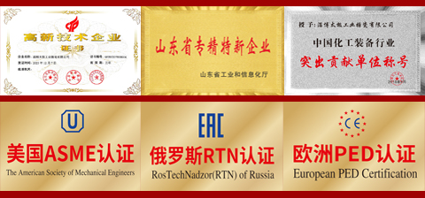淄博太極在中國搪玻璃設(shè)備制造行業(yè)中首家通過ISO90001質(zhì)量體系認(rèn)證,并擁有美國ASME認(rèn)證、歐洲PED認(rèn)證以及國家部門頒發(fā)的搪玻璃制造許可證、進(jìn)出口許可證和百余項榮譽證以及三十六項專利等。